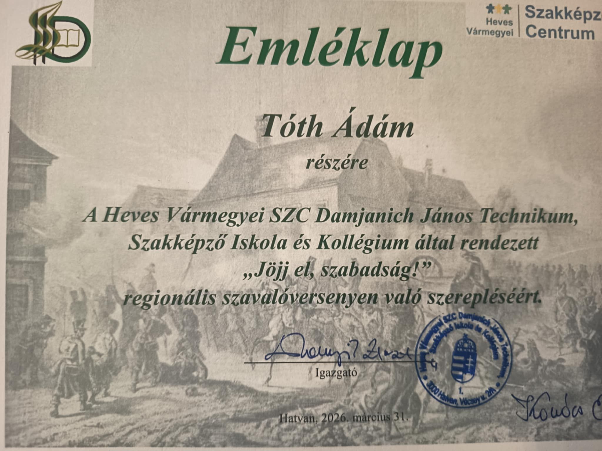 A Heves Vármegyei SZC Damjanich János Technikum, Szakképző Iskola és Kollégium megrendezésében a "Jöjj el, szabadság"! szavalóversenyen